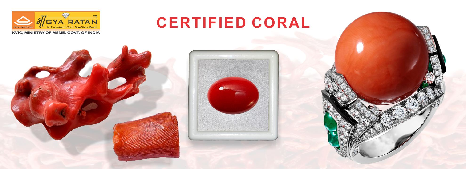 Coral is an organic gem that comes from reefs and atolls. Its ancient names are Vidrum, Marjan, Sinduja, Maheya, Praval Ratna, Musargalva, Latamani, Mangalmani etc. The most valuable coral seen here is the noble red coral (Coralicum rubrum). The color is uniform without any pits or streaks of color. Coral has different colors like red, blood red, sinduri, pink, white, blue, black and golden etc. Polished coral has the luster of glass but is sensitive to heat and acids and may discolor with wear. Coral is an endangered species due to pollution. It is a symbol of courage, bravery, physical strength, blood, bone etc.